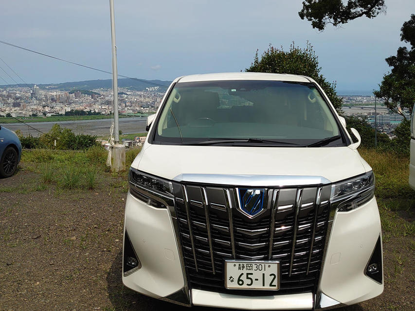 恋人岬の駐車場にて。伊豆の山とアルファード。