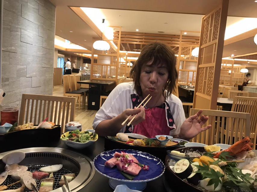 夕食は海鮮や野菜、お肉のグリルが中心でした。お肉も近江牛かな、トロけるような上質の肉で、タレでは良さが味わえないのでお塩でたべました。その他、お寿司やお刺身、数々の季節のお料理など、とても豪華で美味しく頂きました。圧巻は鰻の蒲焼き食べ放題でした。目の前で板前さんが焼いてくれて、出来立てをお腹いっぱい頂きました。