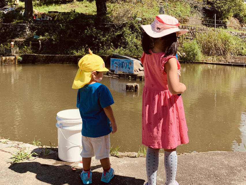 子供達にとっては初めての釣り。事前に釣り堀で練習♪